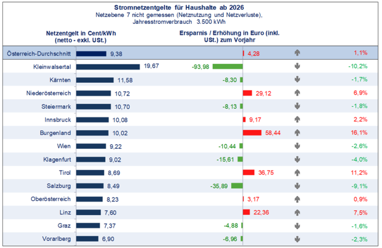 Im österreichweiten Durchschnitt sind die Stromnetzentgelte ab 1. Jänner 2026 nur geringfügig um rund 1 % bis 1,3 % angestiegen. Argumentiert wurde die Erhöhung mit steigenden Investitionen in Netz- und Netzausbau sowie die Berücksichtigung früherer Erlöse.